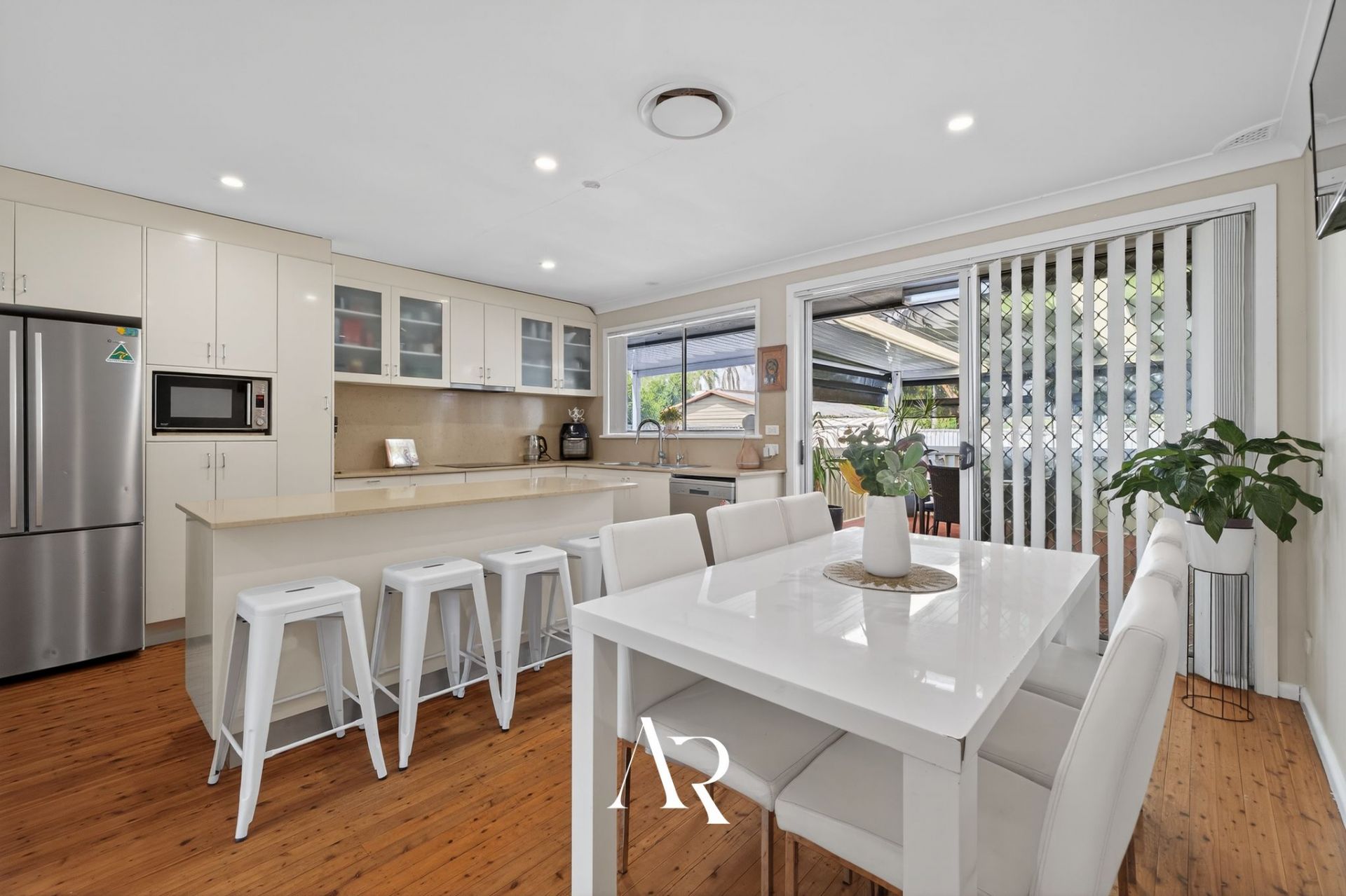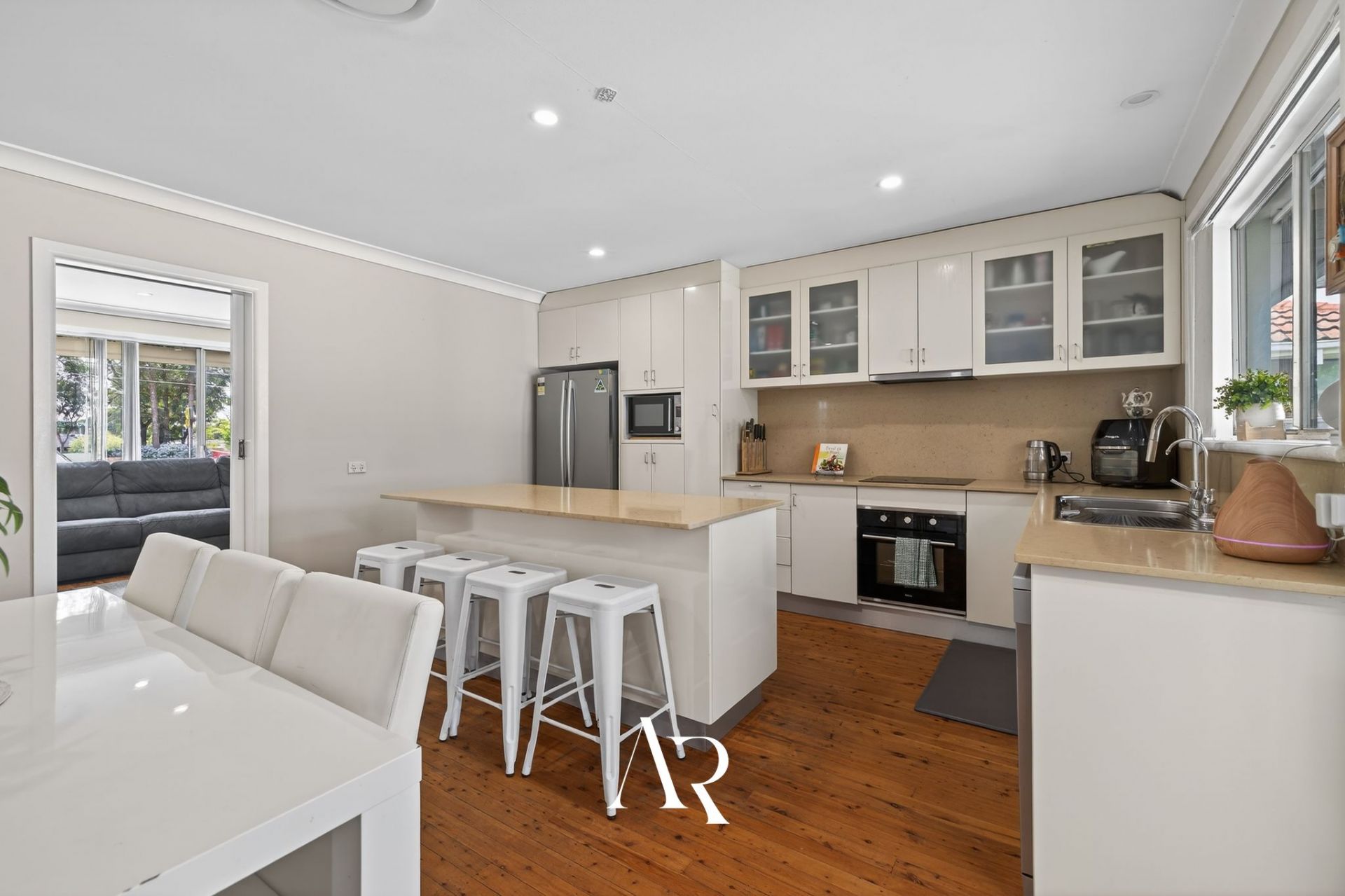 Inside, the home features a spacious living room complemented by an open-plan kitchen and dining area designed for everyday functionality. The kitchen is equipped with stone benchtops, electric cooking, oven and dishwasher, offering ample preparation space and storage. Downlighting and ducted air-conditioning enhance comfort throughout, while openable windows allow for natural light and ventilation.