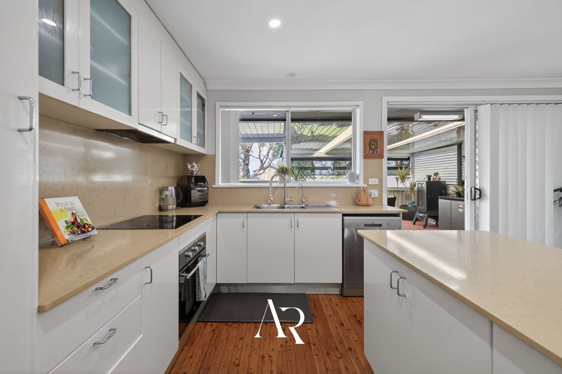 - Kitchen with stone benchtops, electric cooking, oven and dishwasher