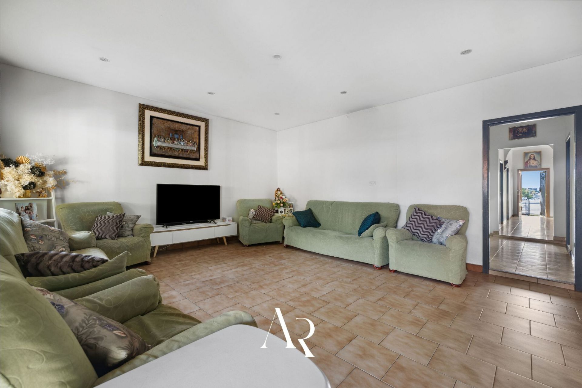 - Multiple living areas with high ceilings and low-maintenance tiles throughout the home.