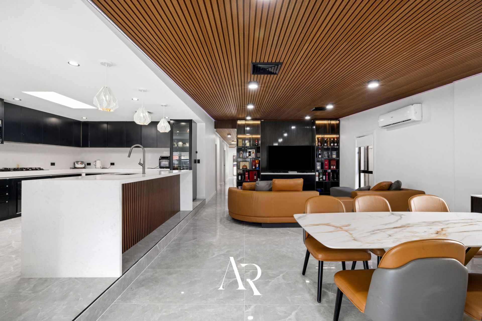 - Gourmet kitchen with stone benchtops, gas cooking, and premium appliances
