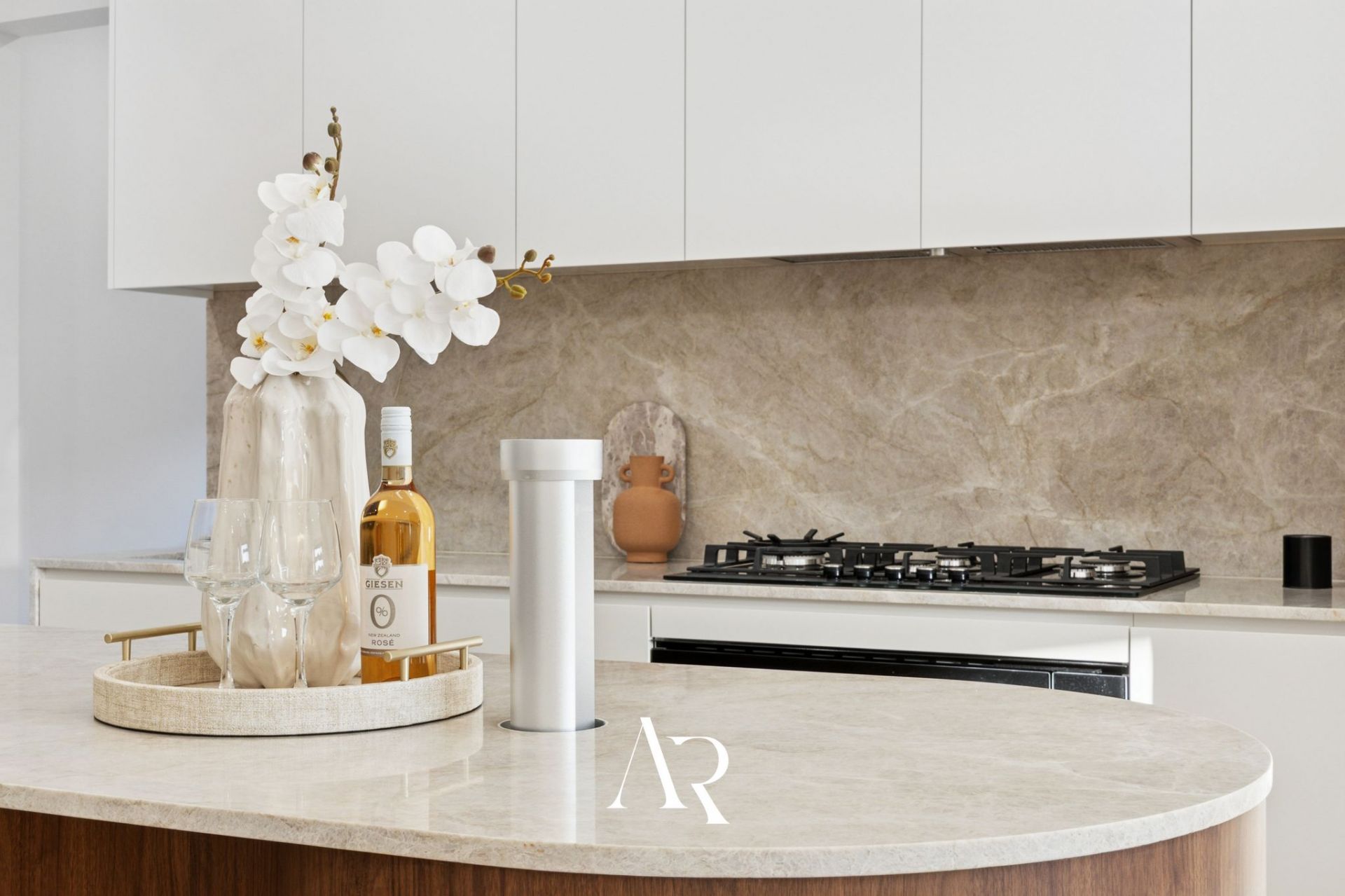 - Gourmet kitchen with stone benchtops, gas cooktop, oven, dishwasher, and walk-in pantry