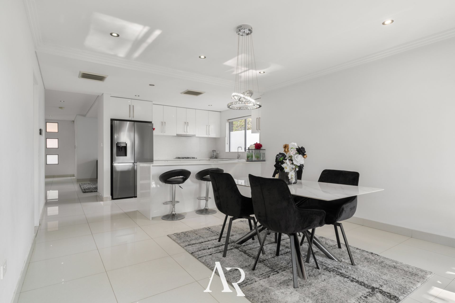 Upon entry, you are welcomed into spacious separate lounge and dining areas, creating defined yet flowing living zones ideal for both relaxed family living and entertaining. The lounge features a built-in television set against a stylish feature wall, adding a modern touch to the space. The contemporary kitchen is centrally positioned and equipped with stainless steel appliances, gas cooking and ample cabinetry, making it both practical and inviting.