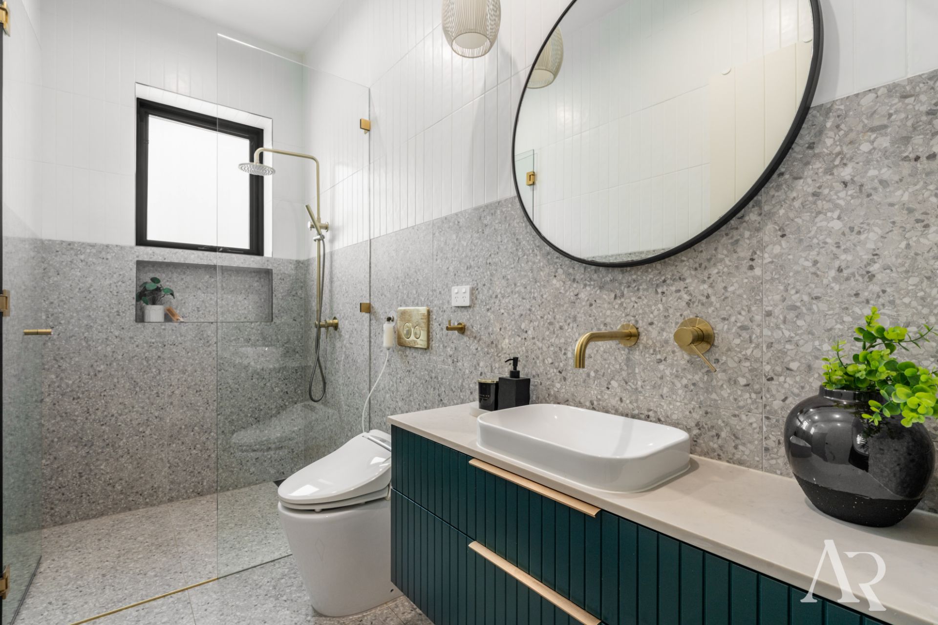 - Three impeccably appointed bathrooms featuring designer gold fixtures, floor-to-ceiling tiling, a guest powder room, stylish ensuite, and a freestanding feature bathtub in the main bathroom