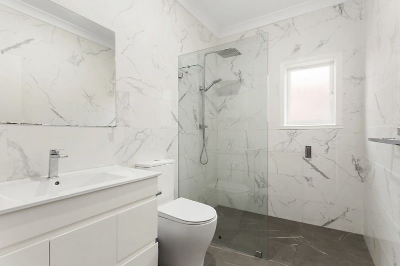 - Renovated bathroom showcases walk-in shower and floor-to-ceiling tiles
