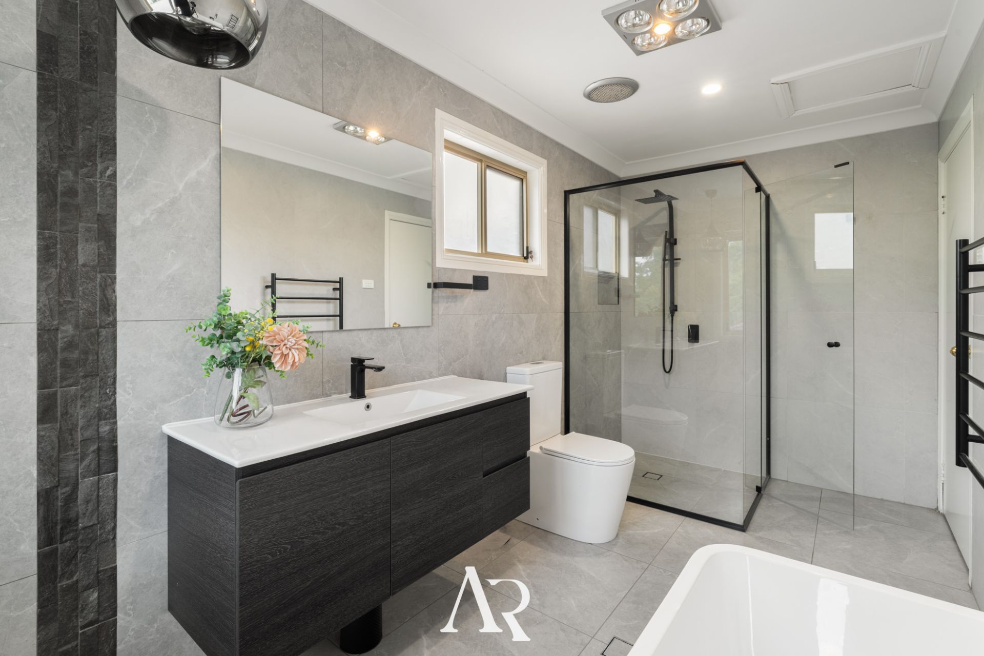 - Stylish main bathroom featuring a freestanding bathtub and floor-to-ceiling tiles