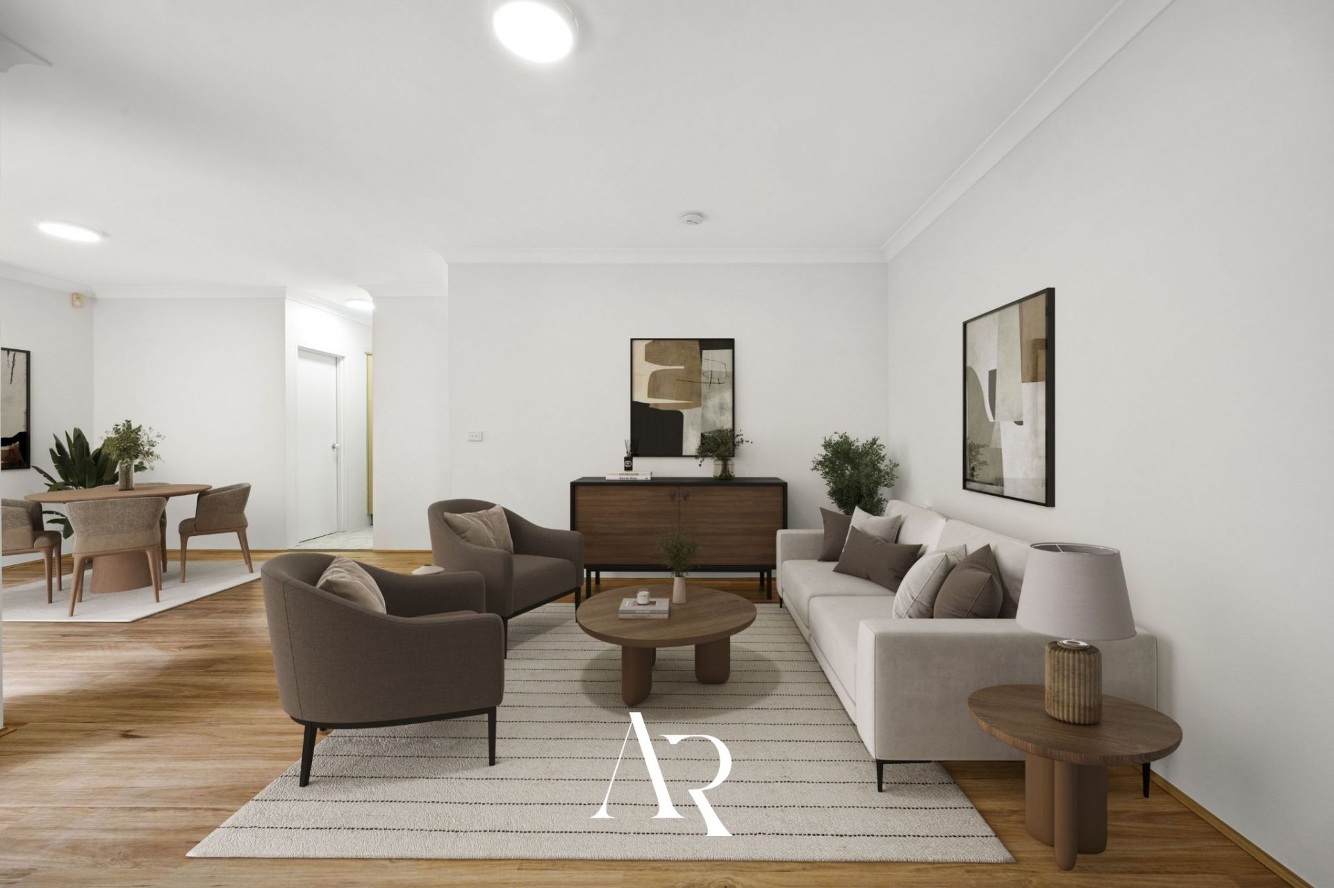 - Open-plan living and dining area with new floorboards
